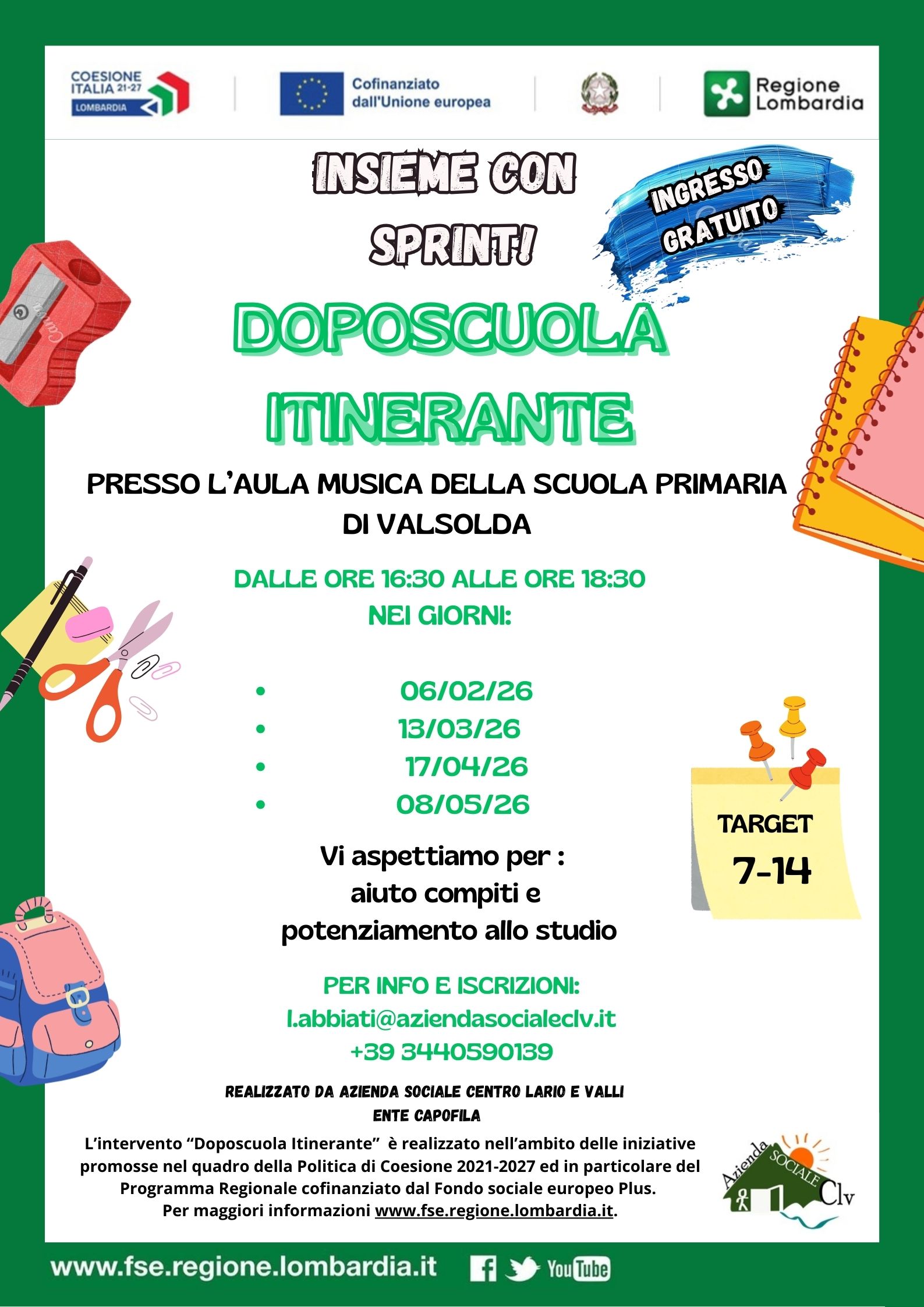 L’Azienda Sociale Centro Lario e Valli organizza gratuitamente  un “DOPOSCUOLA ITINERANTE” per ragazzi dai 7 ai 14 anni!